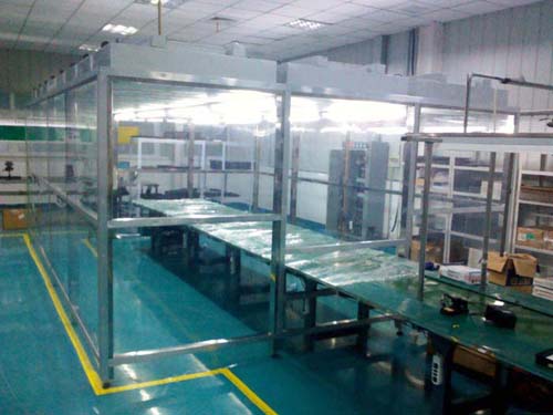 潔凈棚采用工業鋁材(或不銹鋼方通、鐵方通噴塑)作為框架,風機濾網機組(FFU)送風,四周懸掛防靜電垂簾(或鋼化玻璃),其內部凈化級別可達到100-10000級。適用于操作區內局部凈化級別要求高的區域。
