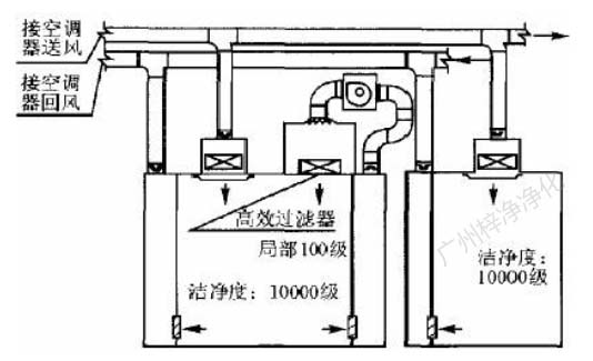 此方式的缺點(diǎn)是設(shè)置循環(huán)風(fēng)機(jī)箱及處理噪聲,需要較大的空間,而通常百級(jí)區(qū)周?chē)L(fēng)管都比較密集,需要精心布局。此方式百級(jí)區(qū)上部靜 壓箱相對(duì)百級(jí)區(qū)室內(nèi)為正壓,頂棚高效過(guò)濾器與吊架間的滲漏,為靜壓箱流向室內(nèi),直接影響百級(jí)區(qū)潔凈度。對(duì)施工質(zhì)量要求較高。(具 體可參考: