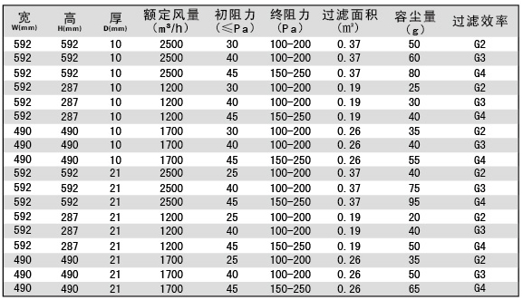 板式初效過濾器技術(shù)參數(shù)
